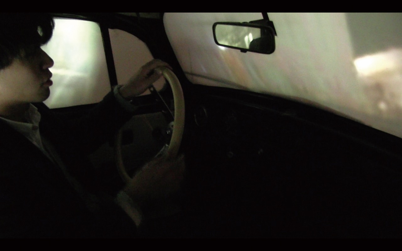 This interactive installation consists of a Volkswagen Type 1 car body and a 1/10 scale radio-controlled car modeled after it. The viewer climbs into the driver's seat and operates the steering wheel, accelerator, and shift lever. The radio-controlled car outside starts to drive in conjunction with the controls. The radio-controlled car is equipped with a small camera, and images from the viewpoint of the radio-controlled car are projected onto the car window. The viewer explores the world from the perspective of an insect or small animal.