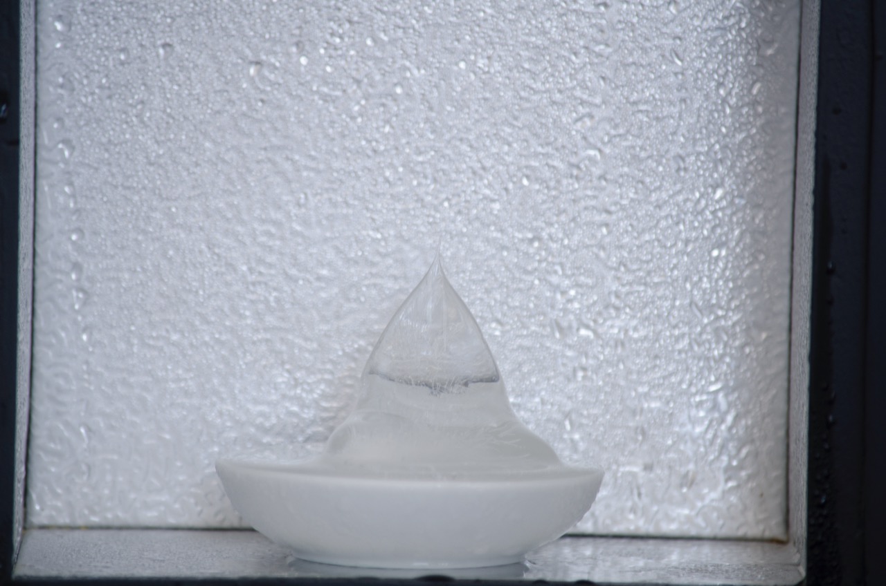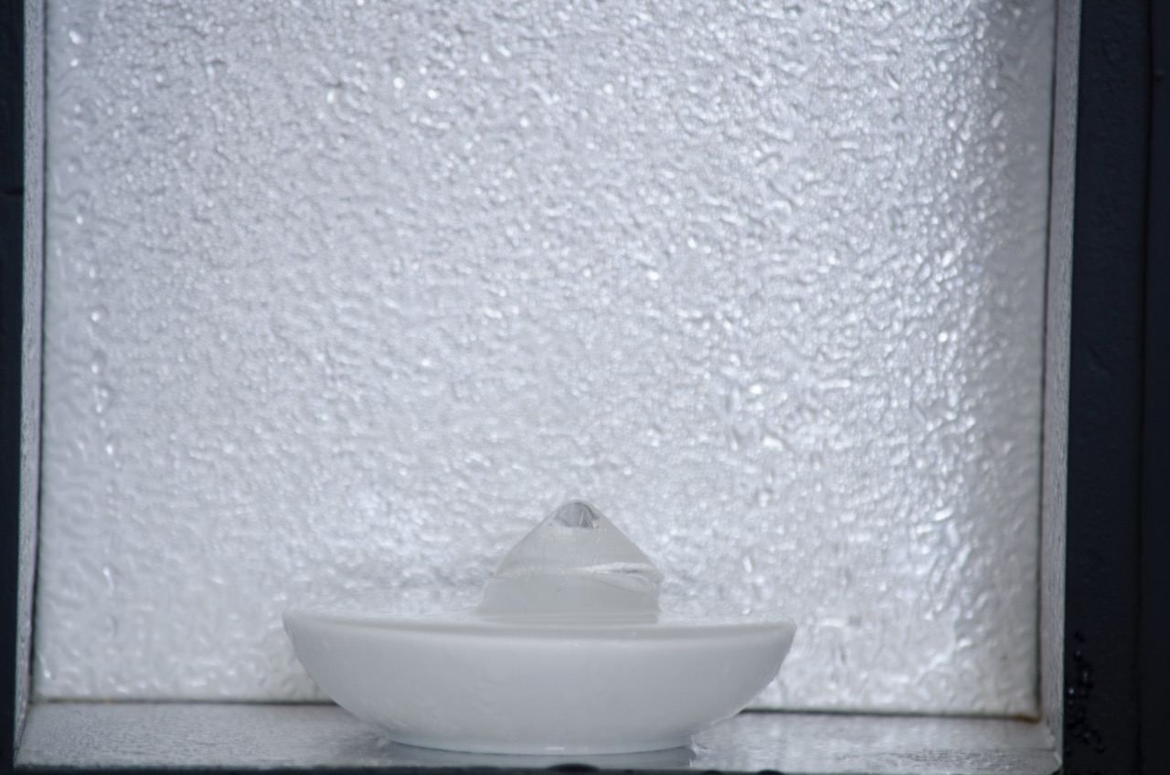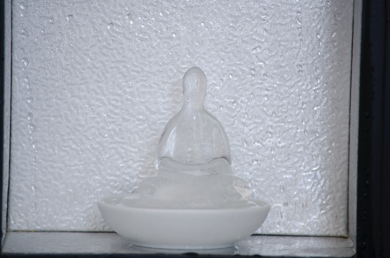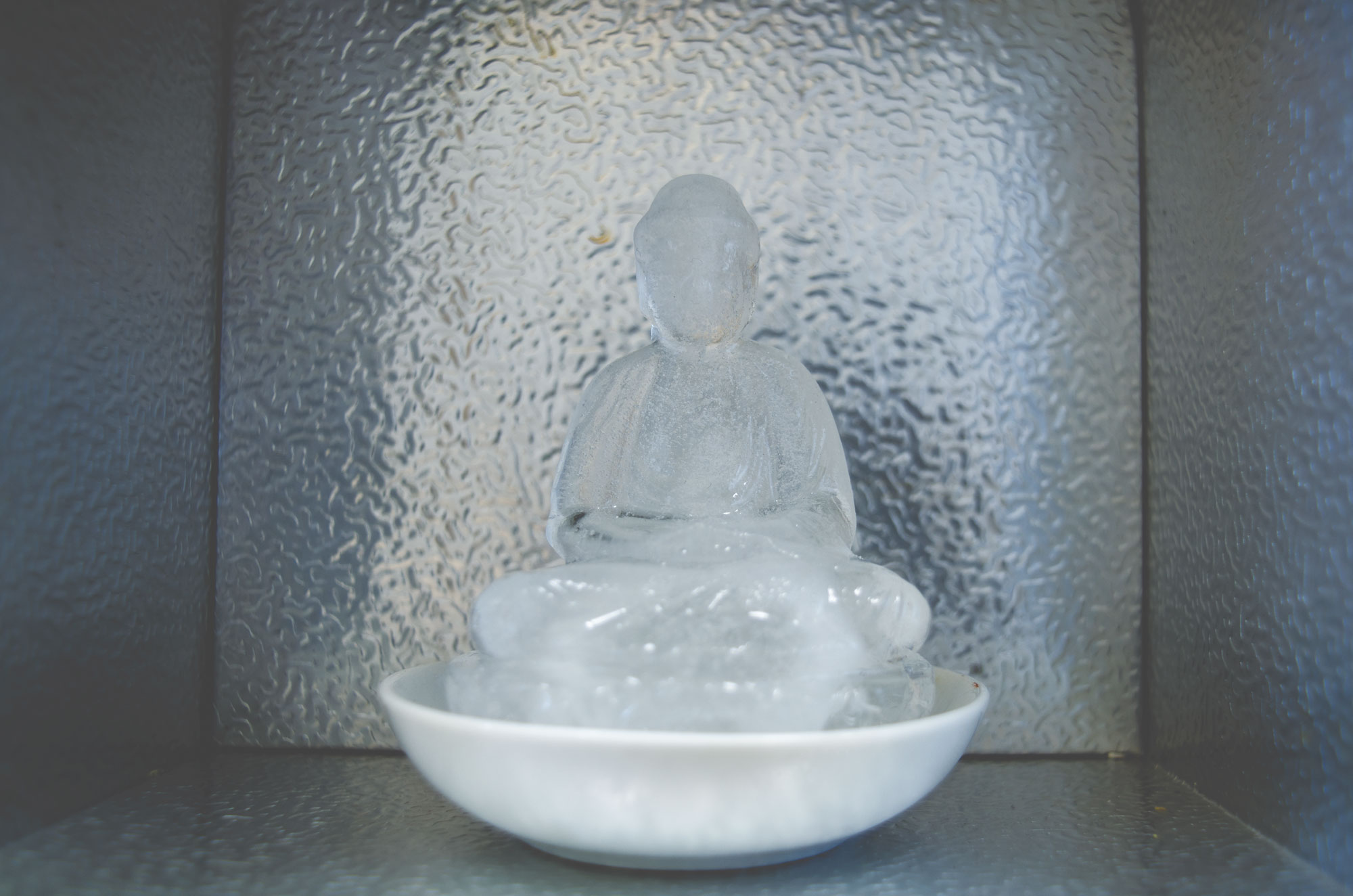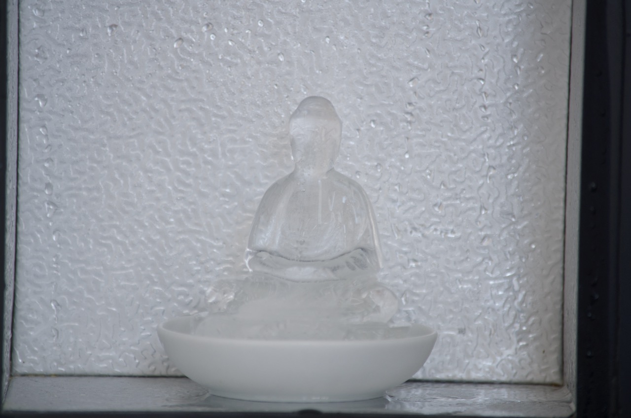 本作では仏像は、鑑賞者の関与によって刻一刻と変化し、連続的な因果関係によって、最終的には消滅してしまいます。仏像と鑑賞者の間には「敵対」の関係が成立していると言えるでしょう。しかし、仏教では、諸行無常というように、変化することは世の摂理であると説かれています。Cold Buddhaは自らの物質性(=仏教用語では「色」と表現されます。)を犠牲にすることによって、私たちと世界の関係性を体現してくれます。