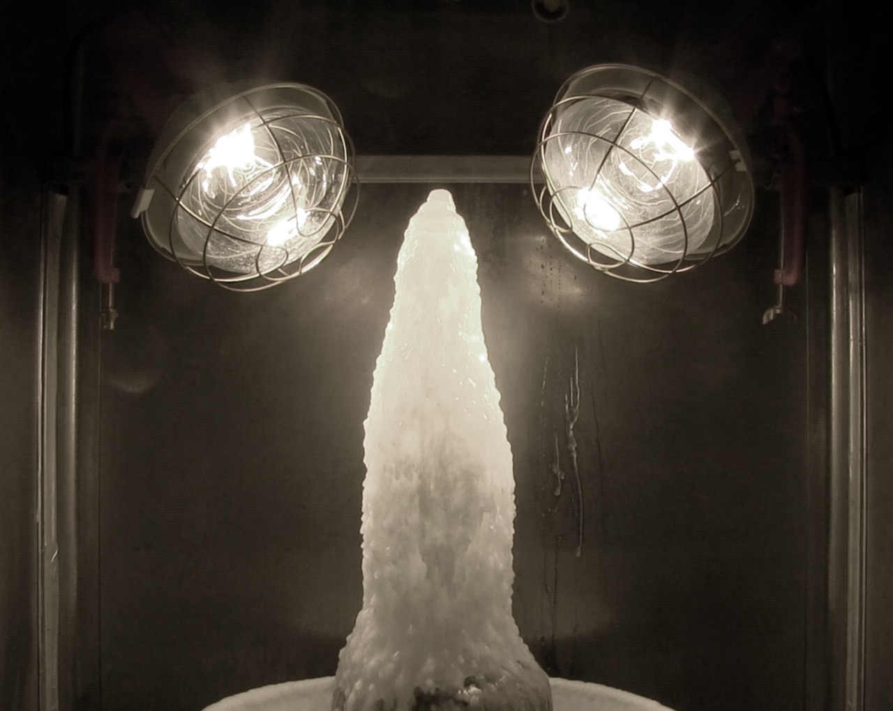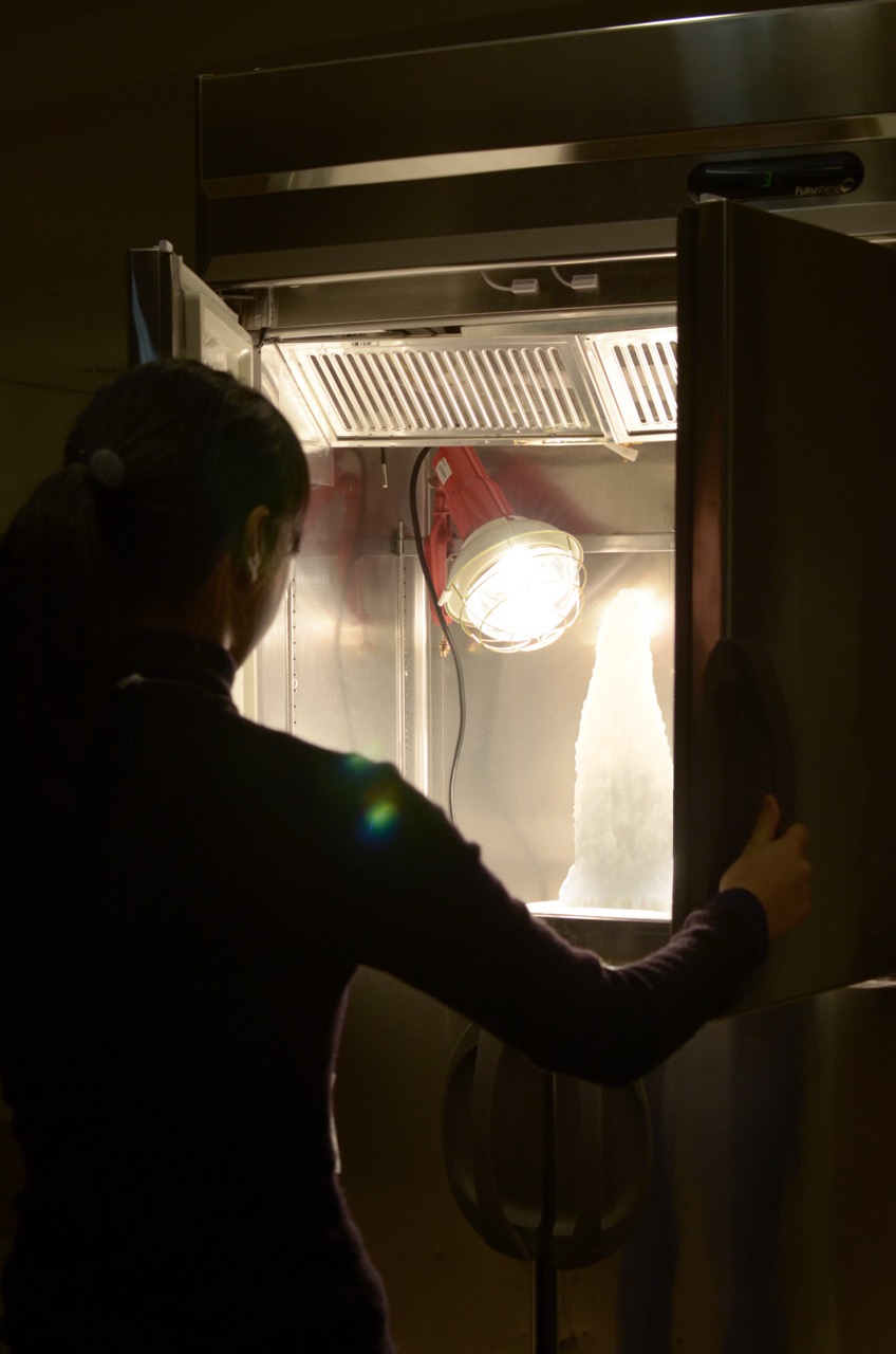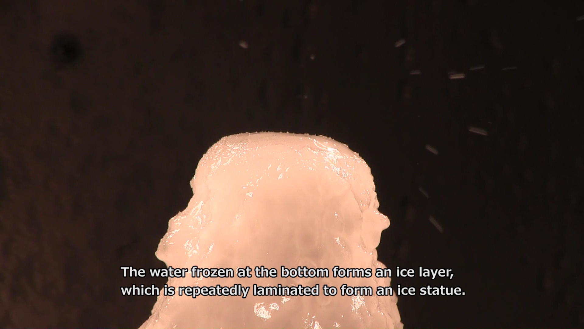 3Dプリンターの原理で水を滴下・積層し、氷の像を自動成型する装置。観音開きの大型冷凍庫から成り、全体を「仏壇」に見立てている。冷凍庫の扉を開けることで生成された氷像を鑑賞することができるが、同時に外気に曝されることで氷像は徐々に溶解する。本作は、鑑賞行為が鑑賞対象を破壊してしまうジレンマを抱えている。やがて氷像の体積が減少したことを制御装置が検知すると、再び成型のフェーズに入り、失われた形状の再生を試みる。他者の干渉を受けながら絶えず変化する様は仏教的世界観を体現している。また、破壊と再生を繰り返しながら同一性を維持する様は、新陳代謝のようでもある。