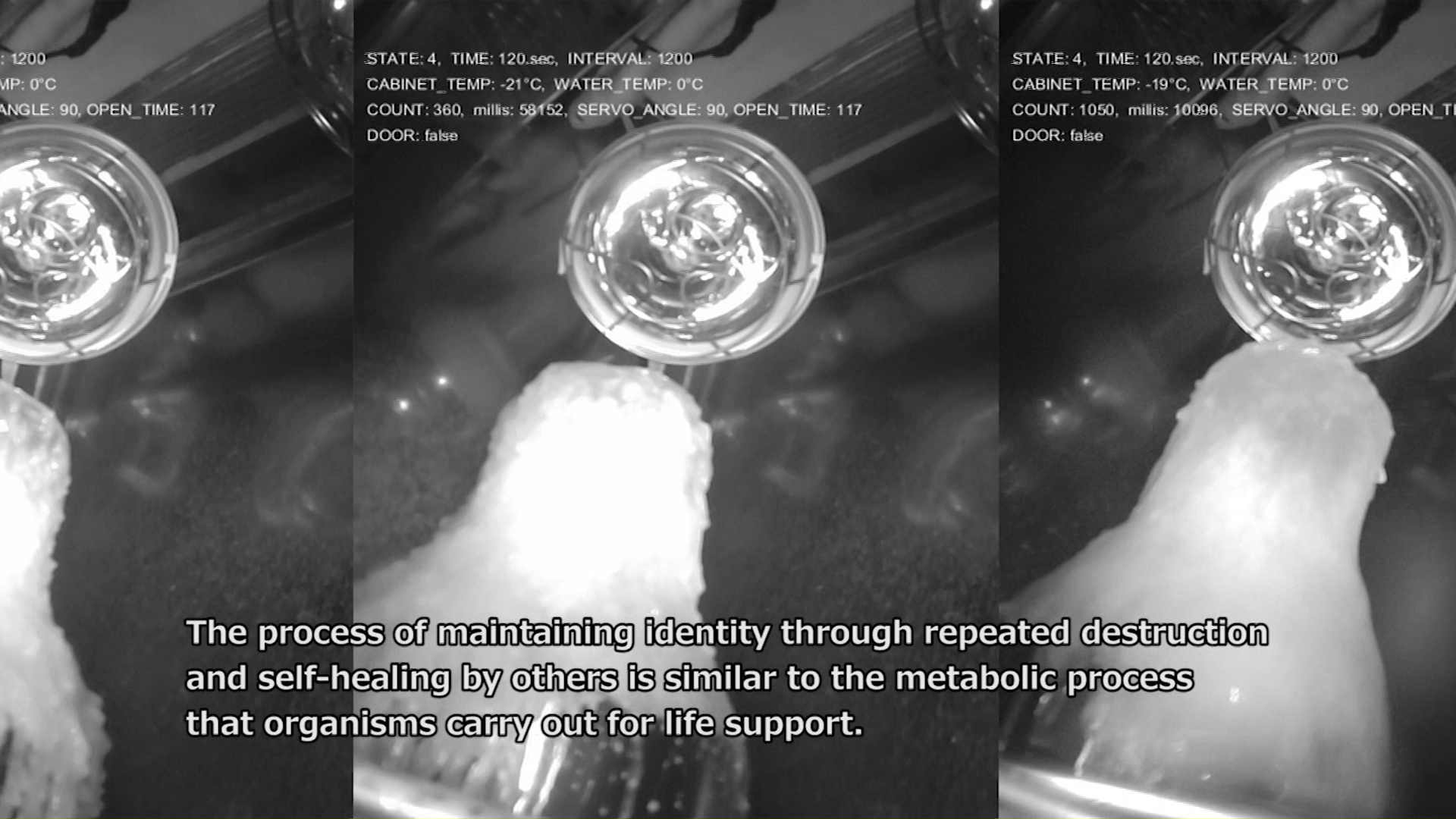 This is a device that automatically forms ice images by dropping and layering water using the principle of a 3D printer. It consists of a large freezer that can be opened in a double-door style, and the entire freezer resembles a "Buddhist altar. By opening the door of the freezer, visitors can view the ice sculptures, but at the same time, the ice sculptures gradually dissolve when exposed to the outside air. This work faces a dilemma in which the act of appreciation destroys the object of appreciation. When the control unit eventually detects that the volume of the ice sculpture has decreased, it enters the molding phase again and attempts to regenerate the lost shape. The constant change of the ice sculpture while being interfered with by others embodies a Buddhist worldview. It also resembles metabolism in the way it maintains its identity while repeatedly destroying and regenerating itself.