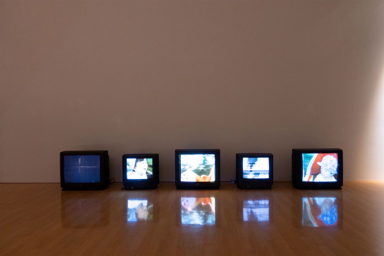 「入力部」のセクションでは、5つのブラウン管テレビに、作家の幼少期の姿を記録したホームビデオがごく短い周期でループ再生されています。磁気テープ特有のノイズを乗せながら断続的に繰り返される古びた映像からは、有限で不可逆的な時間性を意識させられます。