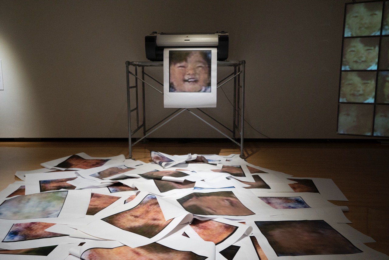 本作は、フェイク動画の製造にも使われる人工知能のアルゴリズムを用いて、作家の幼少の姿を模した自画像を大量に生成するインスタレーションで、自画像の生成過程に沿った3つのセクション「入力部」「生成部」「出力部」から構成されます。