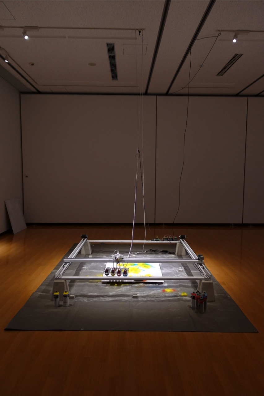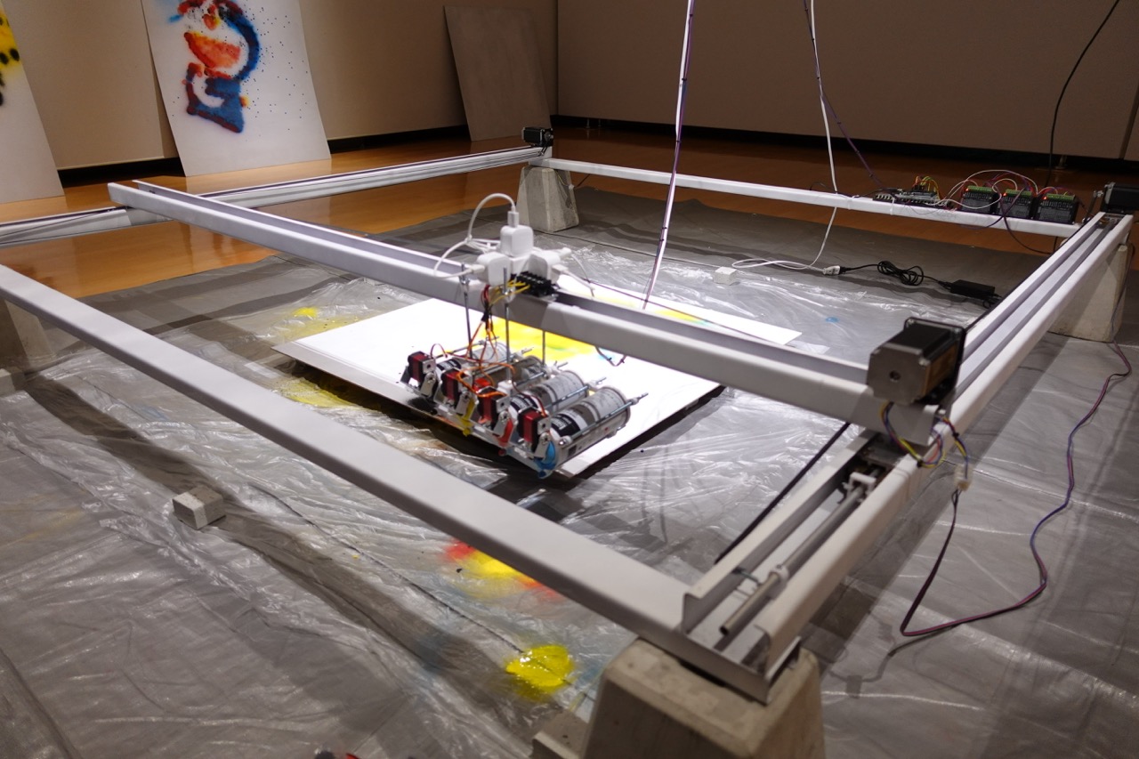 This mechanical installation uses a self-made printing device that mimics the structure of an inkjet printer to draw images of various animated characters obtained from the Internet onto wooden panels. A steel-frame XY-plotter is operated by computer control, and an actuator connected to a spray can is activated to spray acrylic paint.