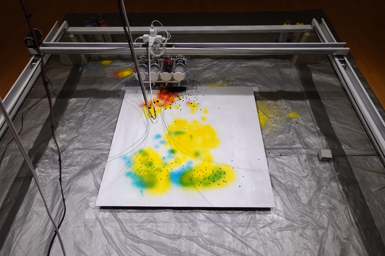 描画される画像には、色や形などに既視感のある特徴が現れますが、粗雑なDIYの動作機構や、スプレー缶の噴射量のブレ、支持体との距離などのアナログな要因によって、再現精度の低い画像が出力されます。情報が損失し、まるで抽象画のように変換された画像は、オリジナル画像との類似性や依拠性の成立を免れます。
