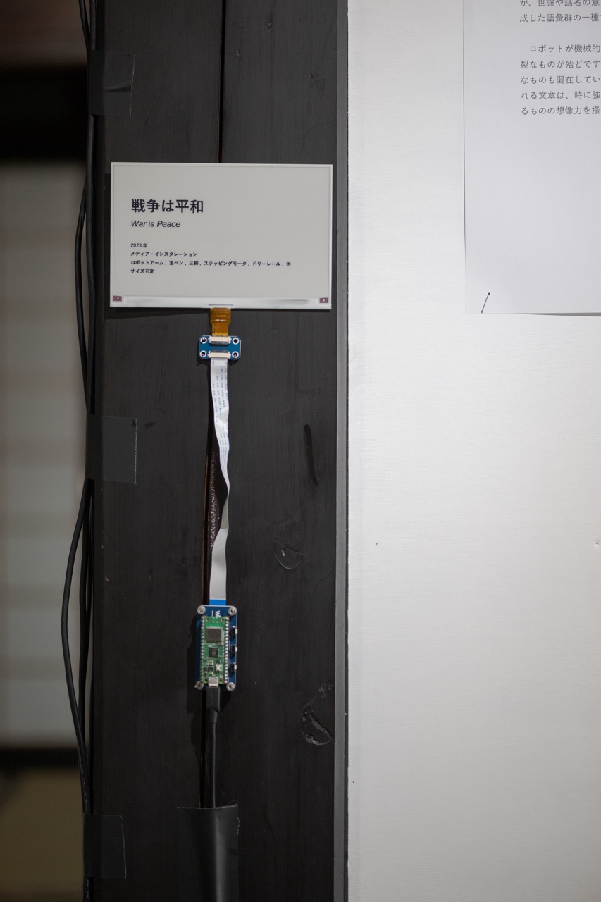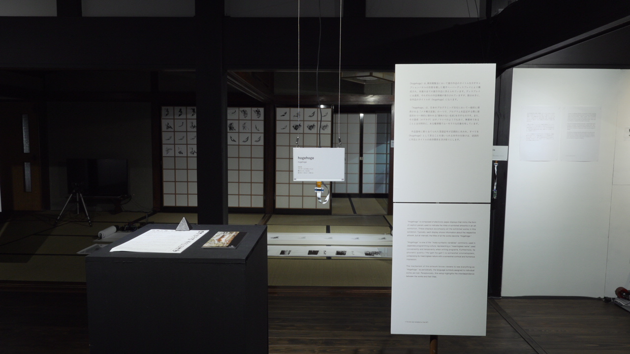 《hogehoge》は、美術展覧会において展示作品のタイトルを示すキャプションパネルの形態を模した電子ペーパーディスプレイにより構成され、本展の全ての展示作品に添えられています。ディスプレイには通常、それぞれの作品情報が表示されていますが、数分おきに、全作品のタイトルが《hogehoge》になります。