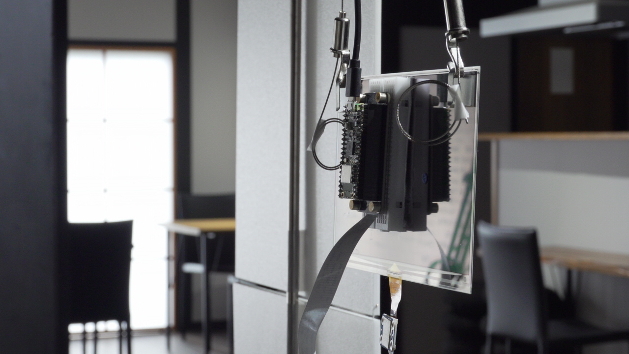 The hogehoge is an electronic paper display that is modeled after the caption panels used in art exhibitions to indicate the titles of exhibited works, and is attached to all works in the exhibition. The display normally shows information about each work, but every few minutes, the title of all works changes to "hogehoge".