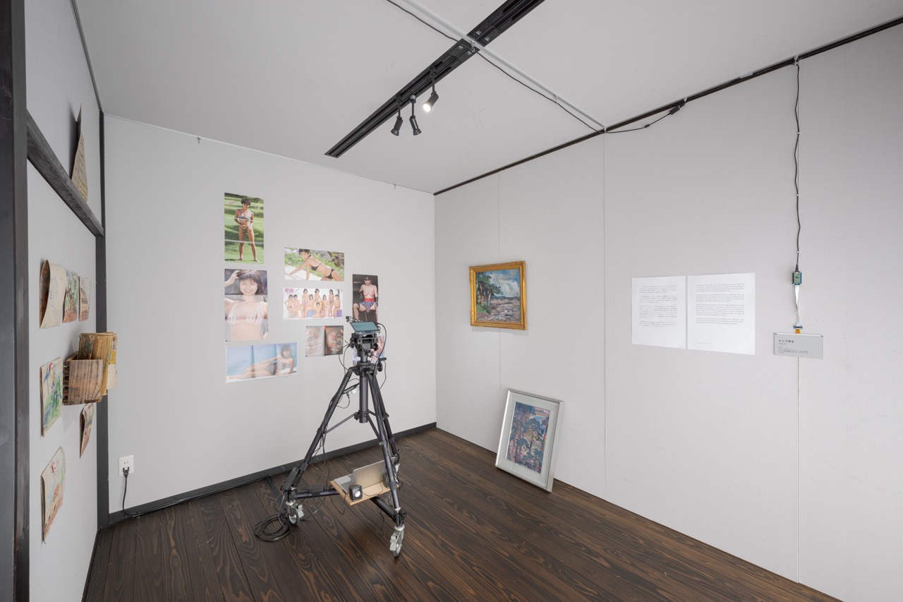《として見る》は、さまざまなモノの「タイトル」を、AIに命名させる作品です。今回は、80年代のセクシャルなピンナップポスター、庄川町の風景が描かれた絵画、ギャラリー無量オーナーの小西さんが幼少期に描いた絵日記をAIに観察させています。