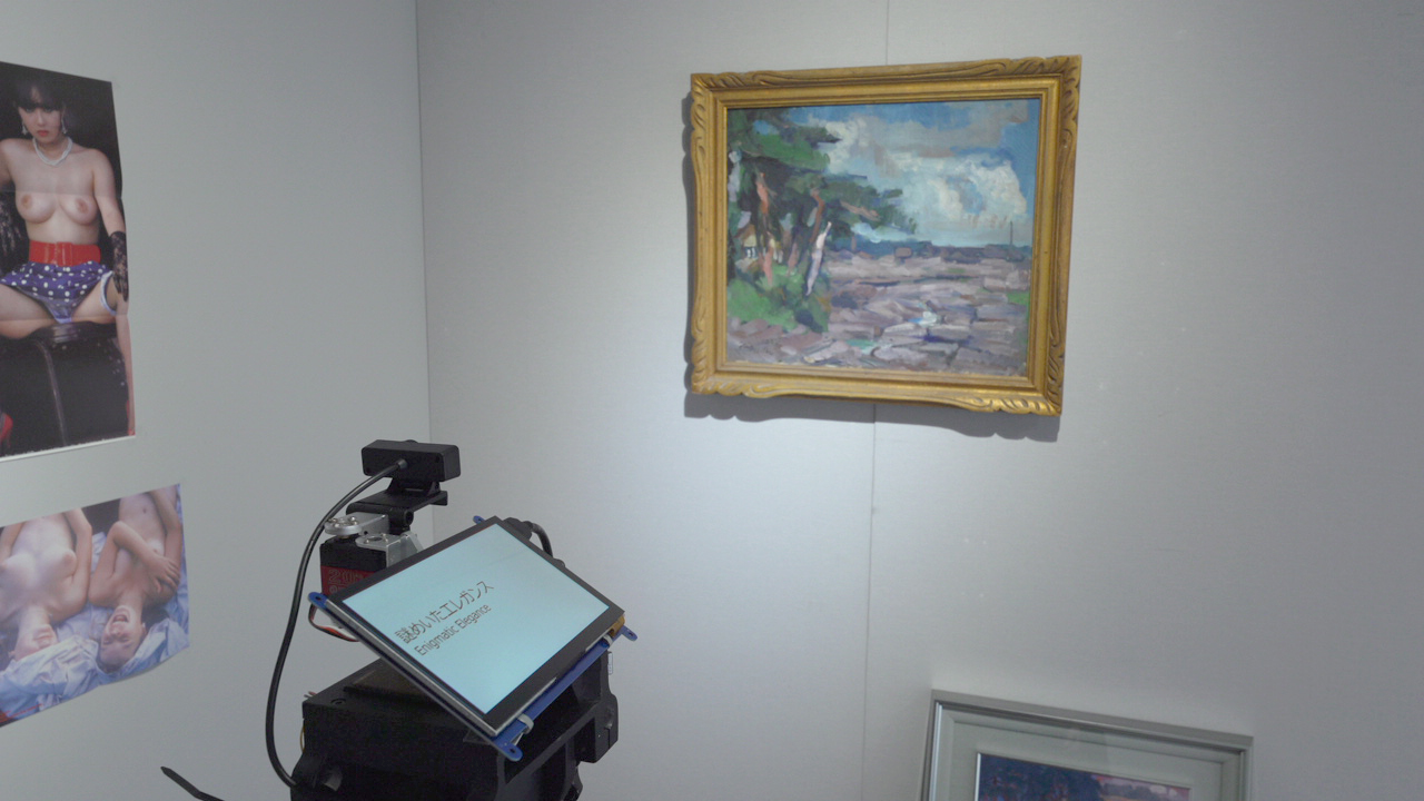 AIは観察対象をカメラによって認識し、画像識別アルゴリズムによって対象が何なのかを推論します。その結果から連想される用語を用いて、1分に1回、タイトルが命名され、装置に取り付けられたキャプションの内容が変化します。