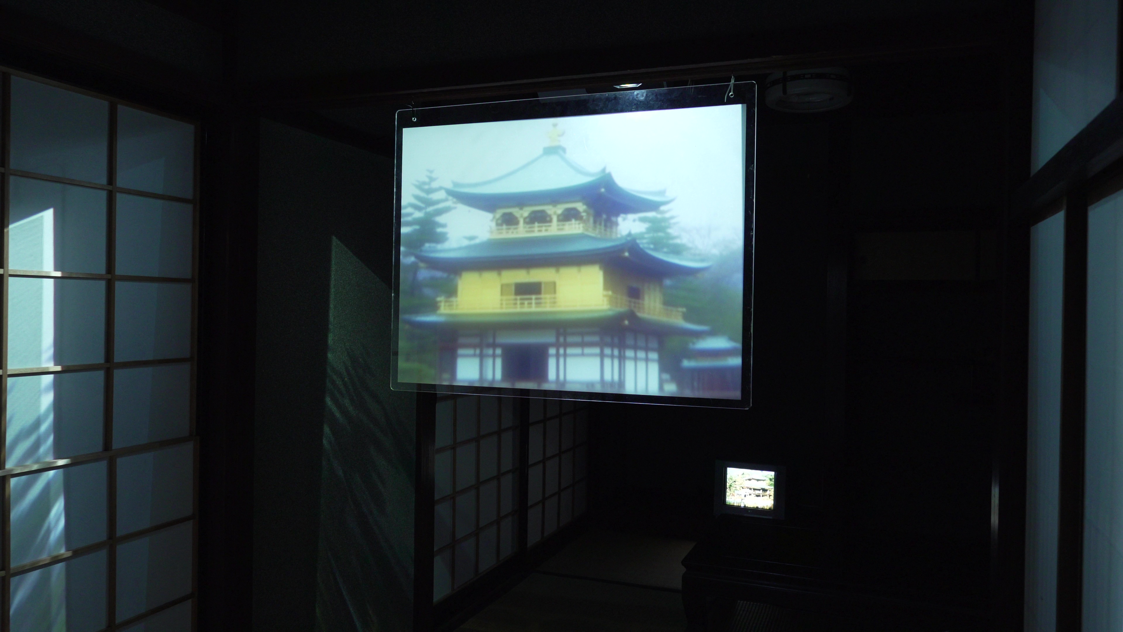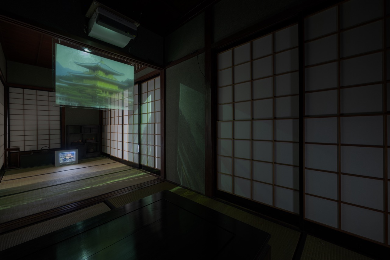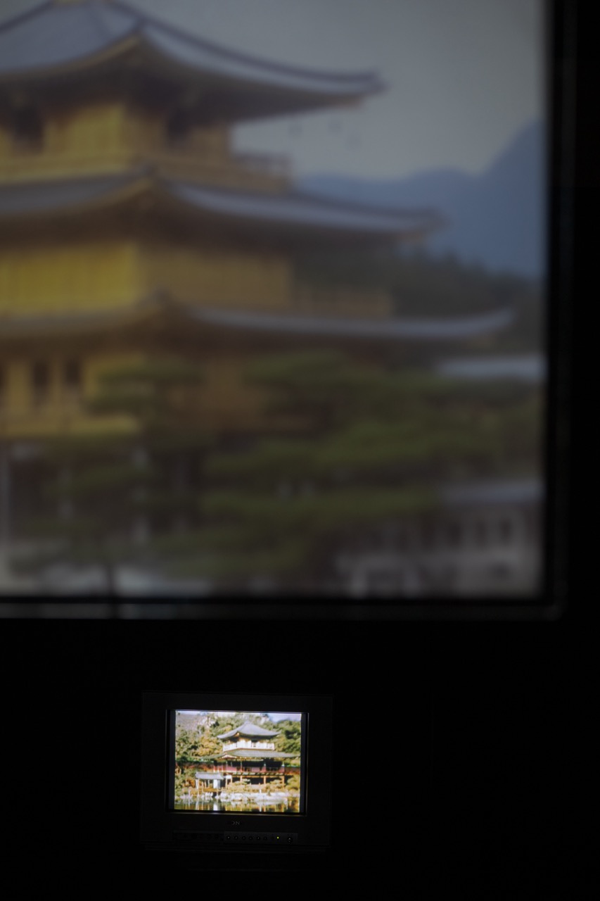 本作は、京都・鹿苑寺の金閣(舎利殿)をモチーフとした映像インスタレーションで、対角上に置かれた2台のブラウン管テレビと、その中間に吊られた1枚の透過スクリーンによって構成されます。ブラウン管テレビには、異なる時間軸で撮影された金閣の映像がそれぞれ映し出されます。一方は、1940年代に撮影された焼失前の金閣で、もう一方はライブカメラに映る再建後の金閣の映像です。これら2つの映像ソースと、国内外の失われた歴史的建造物(ノートルダム大聖堂、首里城、九龍城砦など)の情報を画像生成AIに学習させ、架空の金閣を生成するプロセスが、透過スクリーンに映し出されます。