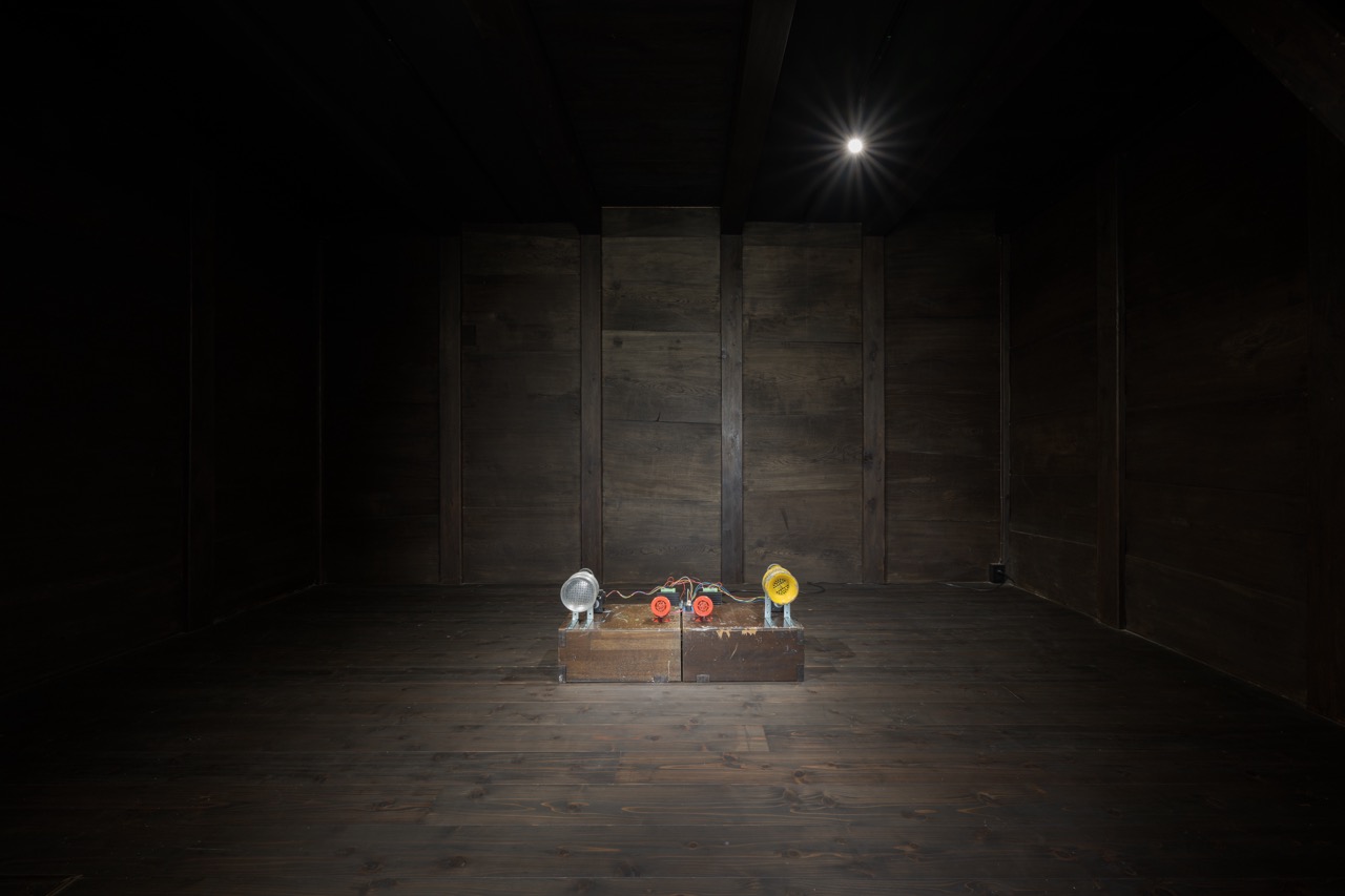 fugafuga is a sound installation composed of an automatic musical device converted from a hand siren once used for air raid warning, firefighting, etc. It was inspired by fugafuga, which is one of the same meta-syntactic variables as "hogehoge. In this work, the artist attempts to perform J.S. Bach's "Fugue in G minor, BWV 578" using this device. A fugue is a counterpoint-based musical form characterized by the regularity with which the theme of the piece is imitated and repeated in other voices.