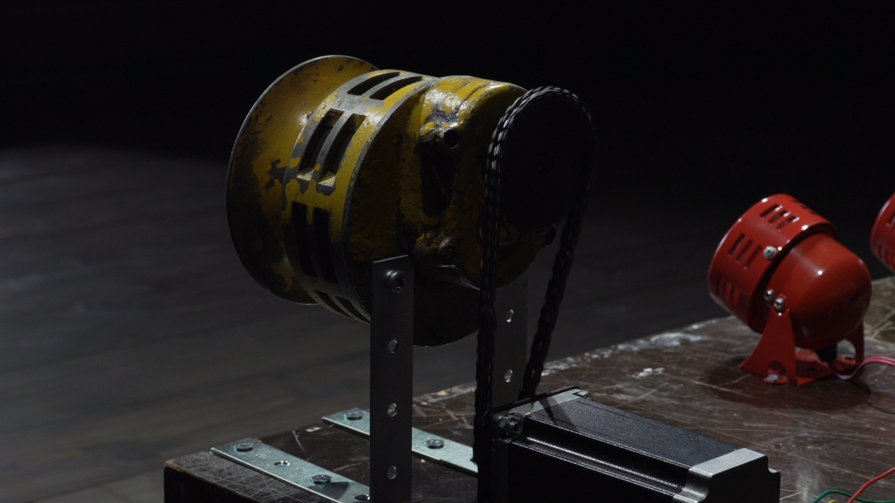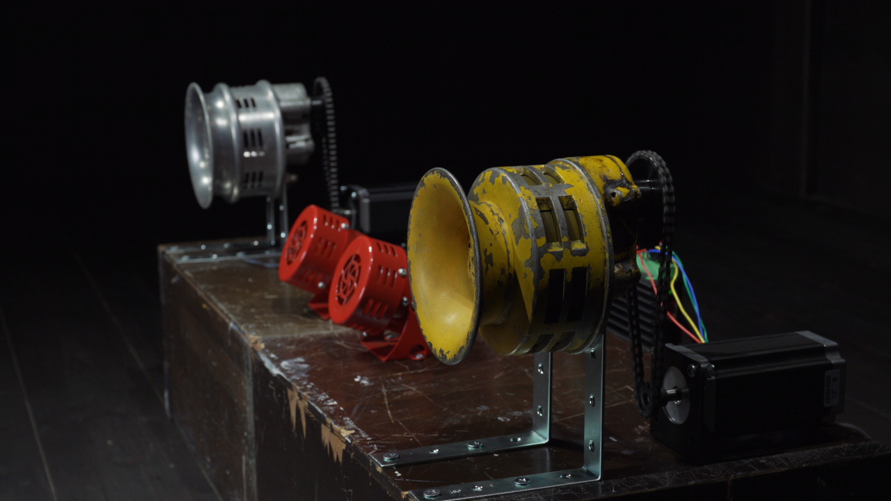 本装置で鳴らすことのできる音階はごく僅かであるうえに、サイレンの構造上、反応速度が非常に遅いため、譜面通りの音は再現できません。空気を吸い込みながら懸命に音を鳴らす様子は生き物のようにも見えます。また、サイレンが奏でる音の、その独特の響きや、元々の用途・歴史性から、不穏な印象を感じるかもしれません。《fugafuga》が奏でる音響空間を、自由に体験してみてください。