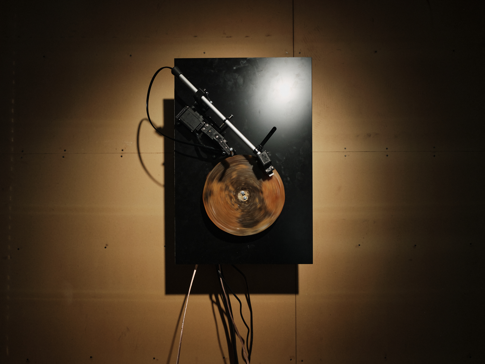 本作では、べっこう飴製のレコード盤に音声波形として刻まれた画像データを解読するプロセスが提示される。この技術は、アメリカ航空宇宙局(NASA)によって1977年に打ち上げられた無人探査機ボイジャーに搭載されたゴールデンレコードに使われた手法に基づく。レコードに記録された画像は、本作が展示される「消えつつ 生まれつつ あるところ」展(金沢市菊川エリア/2024)のメイン会場であるイクヤマ家の元写真家の主人が遺した古写真の中からセレクトされた。レコードが溶けるに従って、やがて記録は消失していく。今も宇宙の彼方を航行し続けるボイジャーの永続性と、生まれては消えていく個人の儚い記憶を対比している。