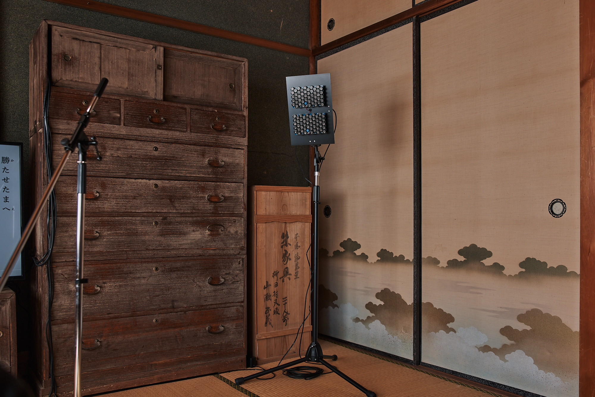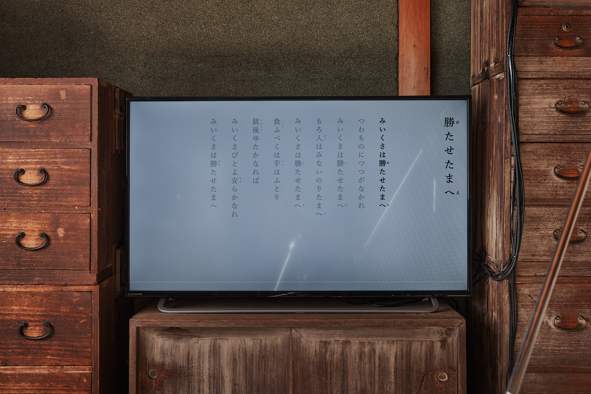 金沢三文豪の一人に数えられる室生犀星の詩集『美以久佐(みいくさ)』の朗読を、鑑賞者自身が行う参加型のサウンドインスタレーション。戦中の1943年に書かれたこの詩集は、戦時下の雰囲気を色濃く反映した詩を多く収めており、犀星の文業の中でも特異な位置付けにある。