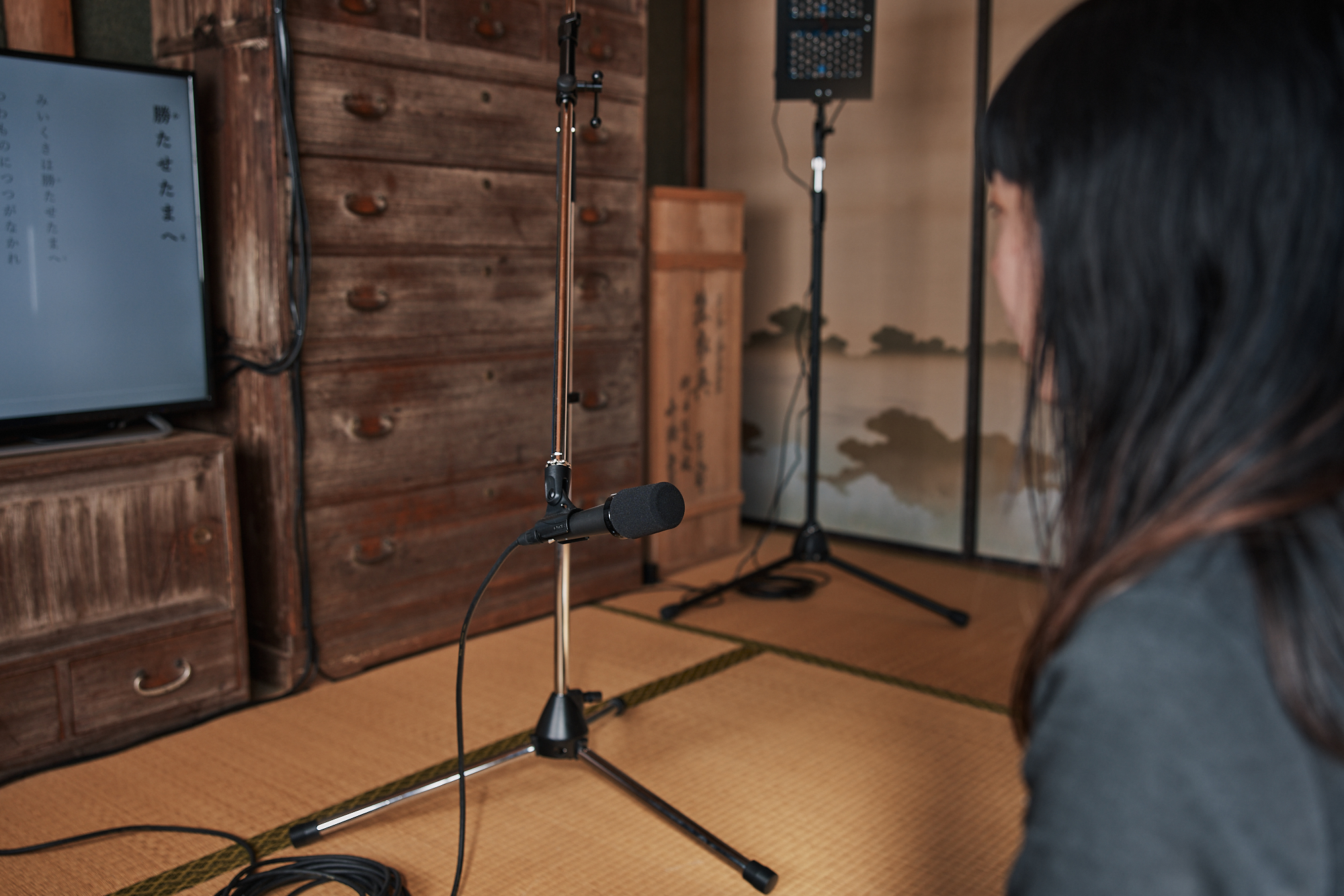 This installation consists of microphones, parametric speakers, and monitors. Excerpts from the poems in Miikusa are displayed sequentially as text on the monitor, and the viewer is invited to recite the displayed phrases into the microphone. After each verse is read, the speaker’s voice is recorded and then “recited” back to them in their own ear through a super-directional speaker using ultrasonic waves.